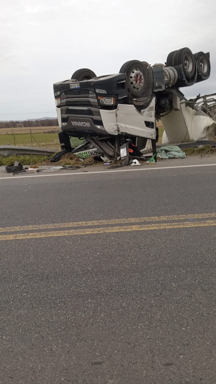 Esta madrugada, alrededor de las 5:00, un camión Scania P410 (dominio AE 319 PH) que transportaba cemento volcó a la altura del kilómetro 638 de la Ruta 51, a unos 50 metros del arroyo Pareta, en la conocida curva de Pillahuincó.