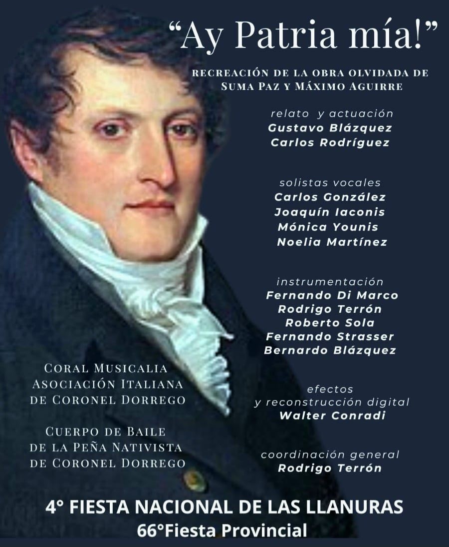 A las 20:30 hs, será la inauguraciòn oficial de la Fiesta-Seguidamente el reestreno de " Ay Patria mìa"-La obra olvidada de Suma Paz y Máximo Ramirez, por el Coral Musicalia de la Asociaciòn Italiana de Dorrego y bajo la dirección del Profesor Rodrigo Terrón-