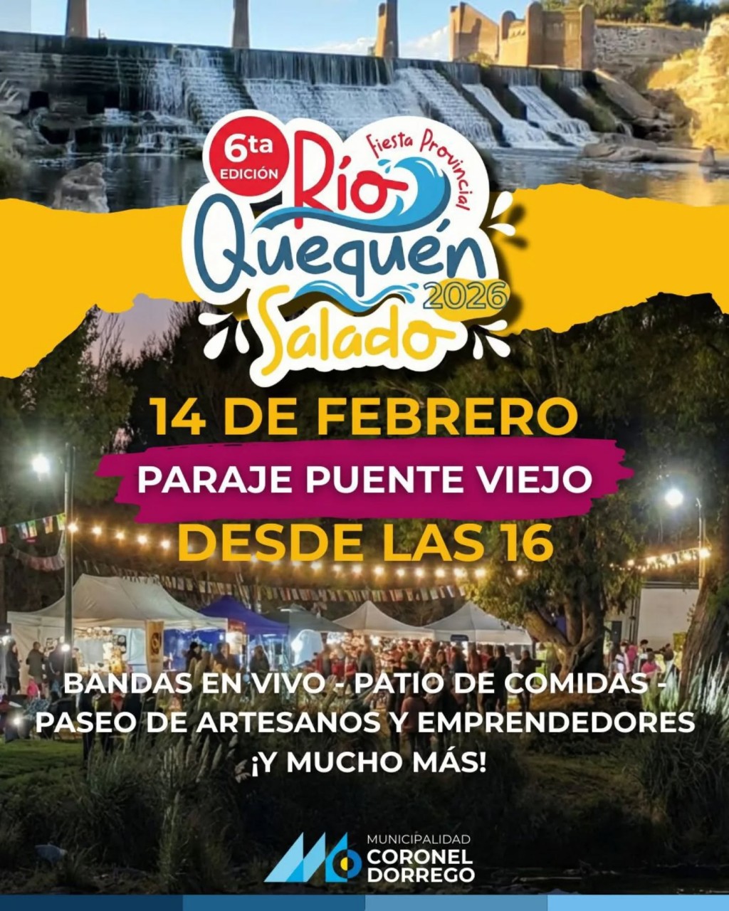 El próximo 14 de febrero, a partir de las 16 horas, el Paraje Puente Viejo, a orillas del Río Quequén Salado, será escenario de una nueva edición de la Fiesta Provincial del Río Quequén Salado.