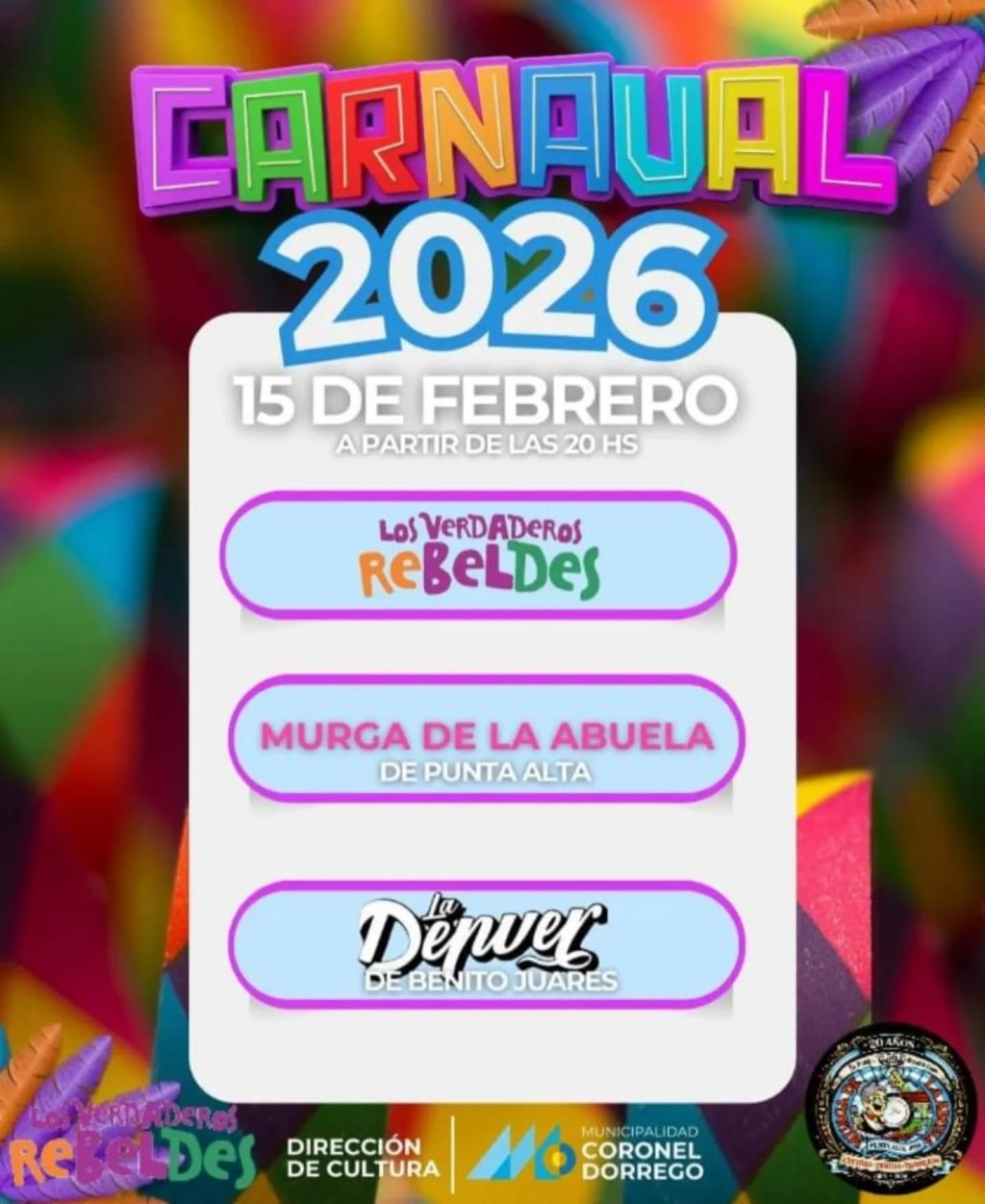 La jornada contará con la participación del Centro Municipal de Murga “Los Verdaderos Rebeldes” de Coronel Dorrego, quienes abrirán el espectáculo con su tradicional energía y talento. En esta edición, por primera vez, visitará Dorrrego la “La Murga de La Abuela”, de Punta Alta, compuesta por 120 integrantes. Cerrará la noche “La Denver”, banda de cumbia proveniente de la ciudad de Benito Juárez, que pondrá a bailar a todos los presentes.