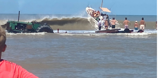 En el mediodía de este martes, se pudo ver en las playas de Claromecó, más específicamente en la zona de la Bajada del Náutico, un tractor que se encontraba en un canal mar adentro.