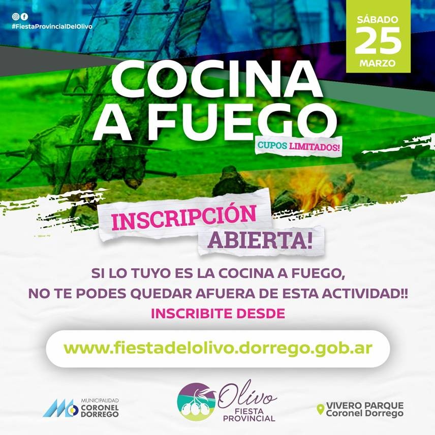 La Municipalidad informó que está abierta la inscripción para participar del evento de cocina a fuego que se realizará el sábado 25 en el Vivero Parque incluído en la Fiesta Provincial del Olivo. Hay cupos limitados y la inscripción se puede formalizar en www.fiestadelolivo.dorrego.gob.ar