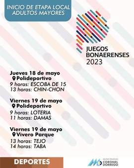 La Subdirección de Deportes de la comuna informó acerca del inicio de la etapa local destinada a adultos mayores de Juegos Bonaerenses 2023. El jueves 18 en el Polideportivo a las 9: Escoba de 15 y a las 13: Chin-Chon; Viernes 19 en el Polideportivo a las 9: Lotería, a las 11: Damas. En el Vivero Parque, a las 13: Tejo, a las 14: Taba.