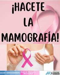Las áreas de Salud y Género y Diversidad de la comuna, a propósito de diferentes acciones que están llevando adelante durante este mes relacionado con la lucha contra el cáncer de mama, recomendaron a través de flyer hacerse mamografía e informaron además que se realiza una exposición de arte en hall de ingreso a la Municipalidad de lunes a viernes hasta las 13.
