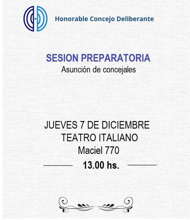 ARTÍCULO 1º) Convócase al Honorable Concejo Deliberante a SESION ============== PREPARATORIA, para el día 7 de diciembre del presente año a la hora 13.00, en instalaciones del Teatro Italiano cito en Maciel 770.-