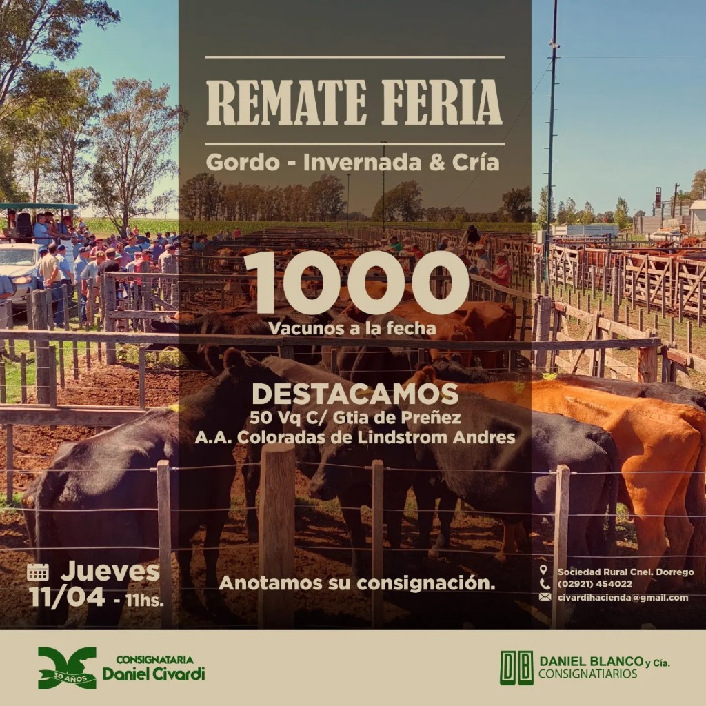 Daniel Civardi consignataria, junto a Daniel Blanco y Cía., realizará el jueves 11 de abril, desde las 11, el remate de gordo, invernada y cría en la Sociedad Rural de Coronel Dorrego.