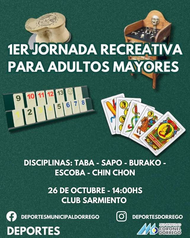Rubén Bilbao, subdirector de Deportes de la comuna informó que se realizará la Primera Jornada Recreativa para Adultos Mayores. Será el 26 de este mes desde las 14 en el Club Sarmiento. Las disciplinas serán: Taba, Sapo, Burako, Escoba y Chin Chon.