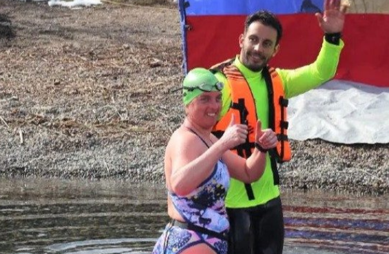Así reconocieron en el balneario a la nadadora de aguas abiertas y heladas en su regreso tras haber cumplido con el desafío de cruzar los 7 lagos del sur argentino en malla y en invierno, convirtiéndose en la primera persona en lograrlo.