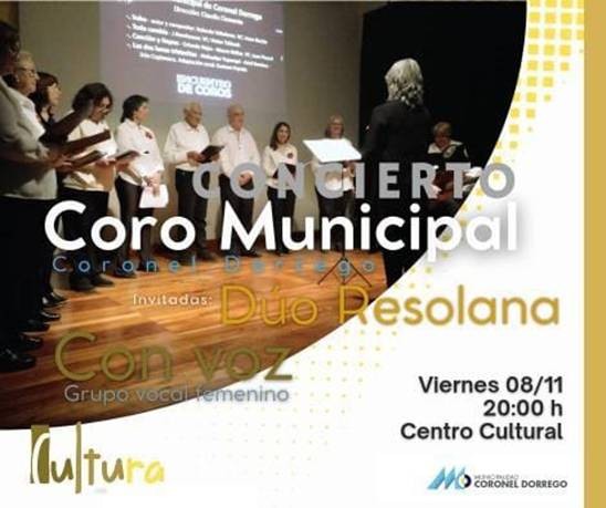 Cultura anunció un concierto del Coro Municipal para el viernes 8 a las 20 en el Centro Cultural. Participará también el grupo vocal femenino Con Voz y el dúo Resolana.