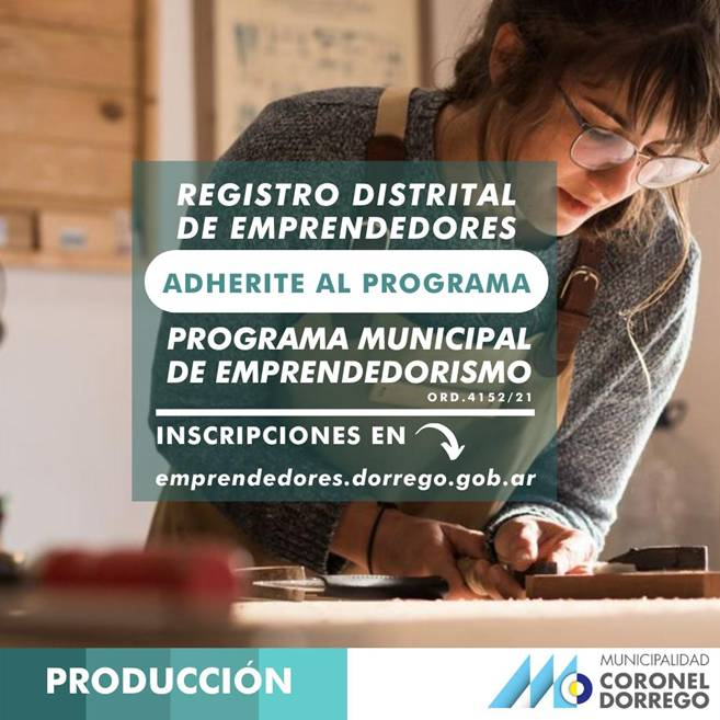 La Dirección de Producción de la comuna abrió el Registro distrital de Emprendedores perteneciente al Programa municipal de Emprendedorismo. Algunos de los objetivos son brindar herramientas para la formulación, evaluación y seguimiento de proyectos que contribuyan a la puesta en marcha de emprendimientos productivos, implementando programas de capacitación y asesoramiento destinados a mejorar los procesos de organización, de producción y de comercialización de la misma; visibilizar las distintas actividades utilizando recursos tecnológicos y de comunicación.