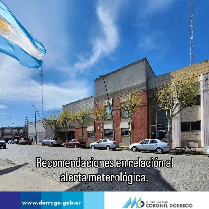 La Municipalidad dio recomendaciones en relación al alerta meterológica. La Municipalidad de Coronel Dorrego ante el fenómeno climático anunciado sobre las horas del mediodía y la tarde de hoy viernes 7, solicita no circular por la vía pública ni en las rutas, no sacar residuos y ante cualquier emergencia comunicarse con el teléfono celular: 2921-401176 del Centro de Monitoreo. Recomendó además tener limpios los desagües y canaletas de los domicilios particulares.
