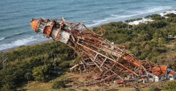 Grafica lo que sería el colapso del Faro Recalada a Bahía Blanca por falta de mantenimiento.