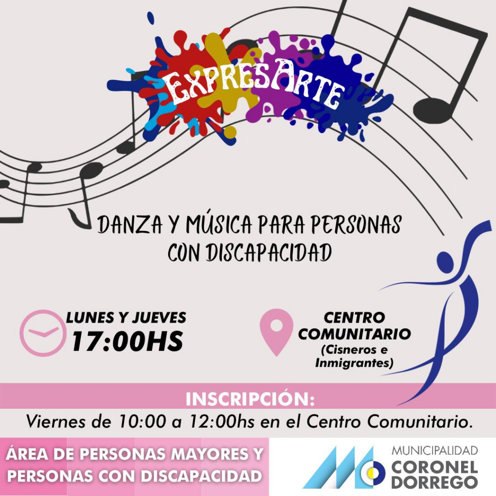 El Área de Personas Mayores y Personas con Discapacidad de la Dirección de Desarrollo Social, invitaron a formar parte del Programa Expresarte que consiste en: Danza y música para personas con discapacidad a partir de los 17 años