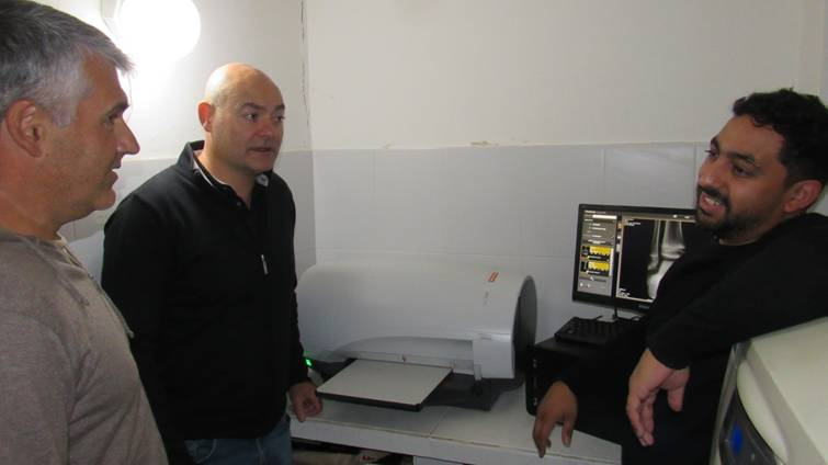 El intendente Raúl Reyes junto al delegado municipal en Oriente, Patricio Bertone, visitaron la Unidad Sanitaria de esa ciudad a propósito de la reciente instalación del equipo de digitalización del servicio de radiología de ese efector de salud del distrito. Según explicaron Bertone y el radiólogo de la Unidad Sanitaria, esto implica un avance tecnológico importante ya que permite obtener una imagen digital y así poder compartirla con otro profesional, en algunos casos especialistas que pueden brindar un diagnóstico. Además, explicaron, permite optimizar los recursos. Las placas pueden ser almacenadas o impresas. El equipo consta de scanner, procesador, chasis y pantallas de fósforo, computadora, monitor, negatoscopio, impresora, entre otros elementos.