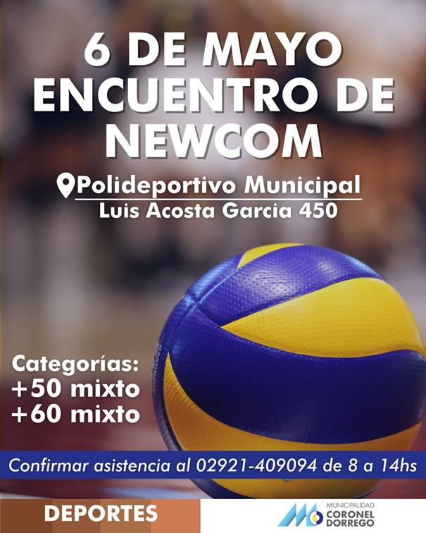 Deportes de la comuna informó que el venidero 6 de mayo se realizará un encuentro de Newcom en el Polideportivo Municipal. Estará destinado a las categorías +50 mixto y +60 mixto. Se puede confirmar asistencia llamando al 02921-409094 de 8 a 14.
