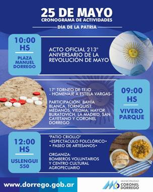 La Municipalidad informó el cronograma de actividades que se desarrollarán el próximo 25 de mayo. A las 10 en la Plaza Central, el Acto Oficial por el 213º aniversario de la Revolución de Mayo. Desde las 9 en el Vivero Parque se estará desarrollando el 17º Torneo de Tejo "Homenaje a Estela Vargas". Participación de jugadores de: Bahía Blanca, Tornquist, Médanos, Viedma, Mayor Buratovich, La Madrid, San Cayetano y Coronel Dorrego. A las 12 en Uslenghi 550 "Patio Criollo" con espectáculo folclórico y paseo de artesanos, organizado por Bomberos Voluntarios y Centro Cultural Agropecuario.