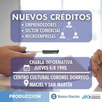Producción de la comuna informó que mediante el Banco Nación, se brindará una charla informativa sobre nuevos créditos. La misma está destinada a emprendedores, sector comercial y microempresas. Será el jueves 4 de agosto a las 19 en el Centro Cultural, en San Martín y Maciel.