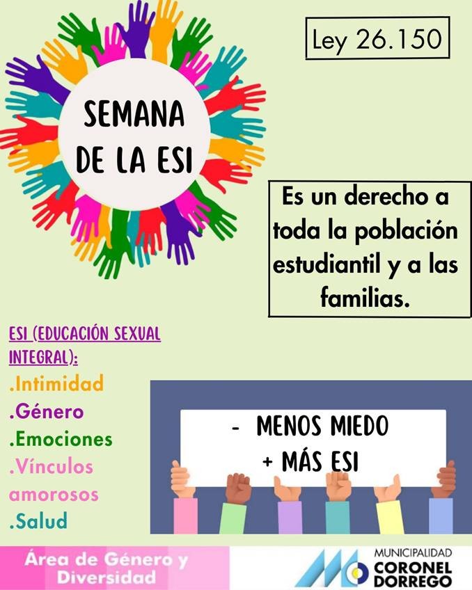 El Área de Género y Diversidad de la comuna se pronunció respecto de la semana de la Educación Sexual Integral (ESI) mencionando que "Es un derecho a todos los niños, niñas y adolescentes. Se encuentra establecido en la ley nacional 26.150".