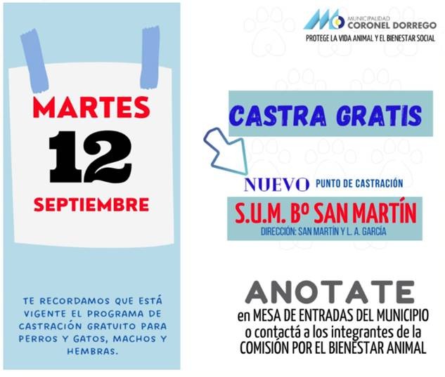 Bromatología de la comuna informó que se ha sumado un nuevo punto de realización de castraciones de mascotas en esta ciudad. El martes 12 de septiembre en el S.U.M del Barrio San Martín se realizarán castraciones gratuitas y para ello hay que anotarse previamente en Mesa de Entradas del municipio o bien a través de integrantes de la Comisión por el Bienestar Animal.