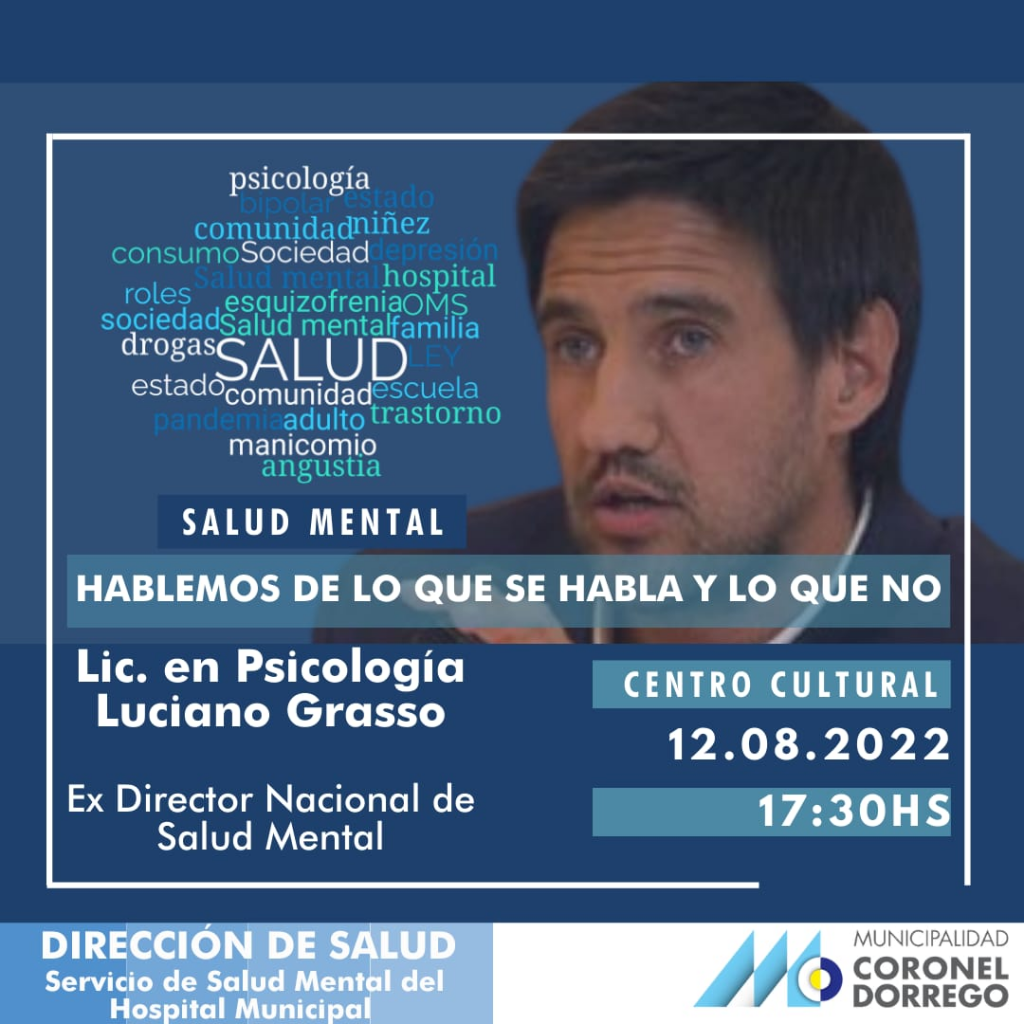 La Dirección de Salud de la Municipalidad de Coronel Dorrego y el Servicio de Salud Mental dependiente del Hospital Municipal, informan que el próximo viernes 12 en el Centro Cultural, a las 17: 30 se llevará a cabo la Charla abierta a la comunidad “Salud Mental: Hablemos de lo que se habla y de lo que no”.