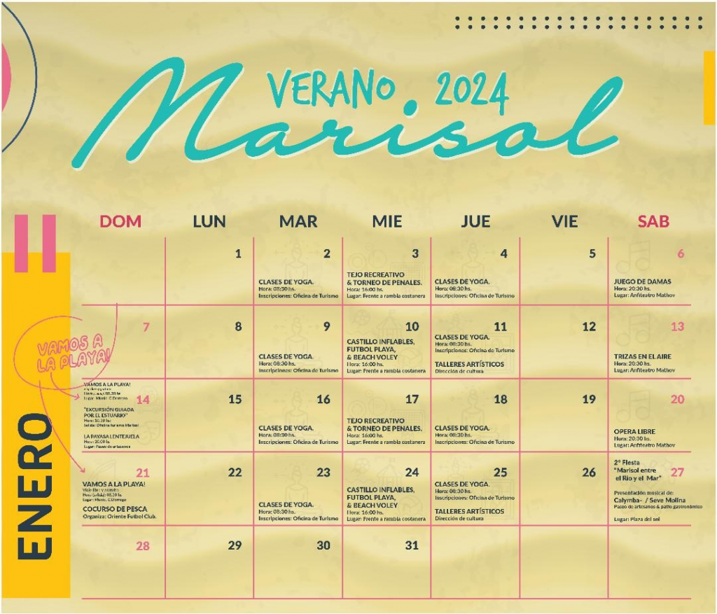 El Área de Turismo Municipal informa que esta semana comienzan las actividades programadas para el mes de enero en el Balneario Marisol. Se ofrecerán en forma libre y gratuita espectáculos musicales, actividades deportivas y recreativas en la playa como así también talleres culturales.