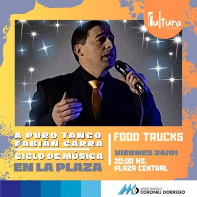 Cultura anunció para mañana viernes 26 a las 20 en la Plaza Central de Coronel Dorrego la actuación del cantante de tangos Fabián Carra. Además se informó desde la organización que habrá food trucks.