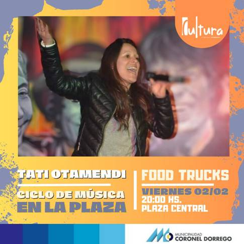 En el marco del ciclo Música en la Plaza, para hoy viernes 2 de febrero, desde las 20, la Dirección de Cultura anunció la presentación de la cantante Tati Otamendi. Se mencionó también que habrá food trucks, con propuestas gastronómicas.